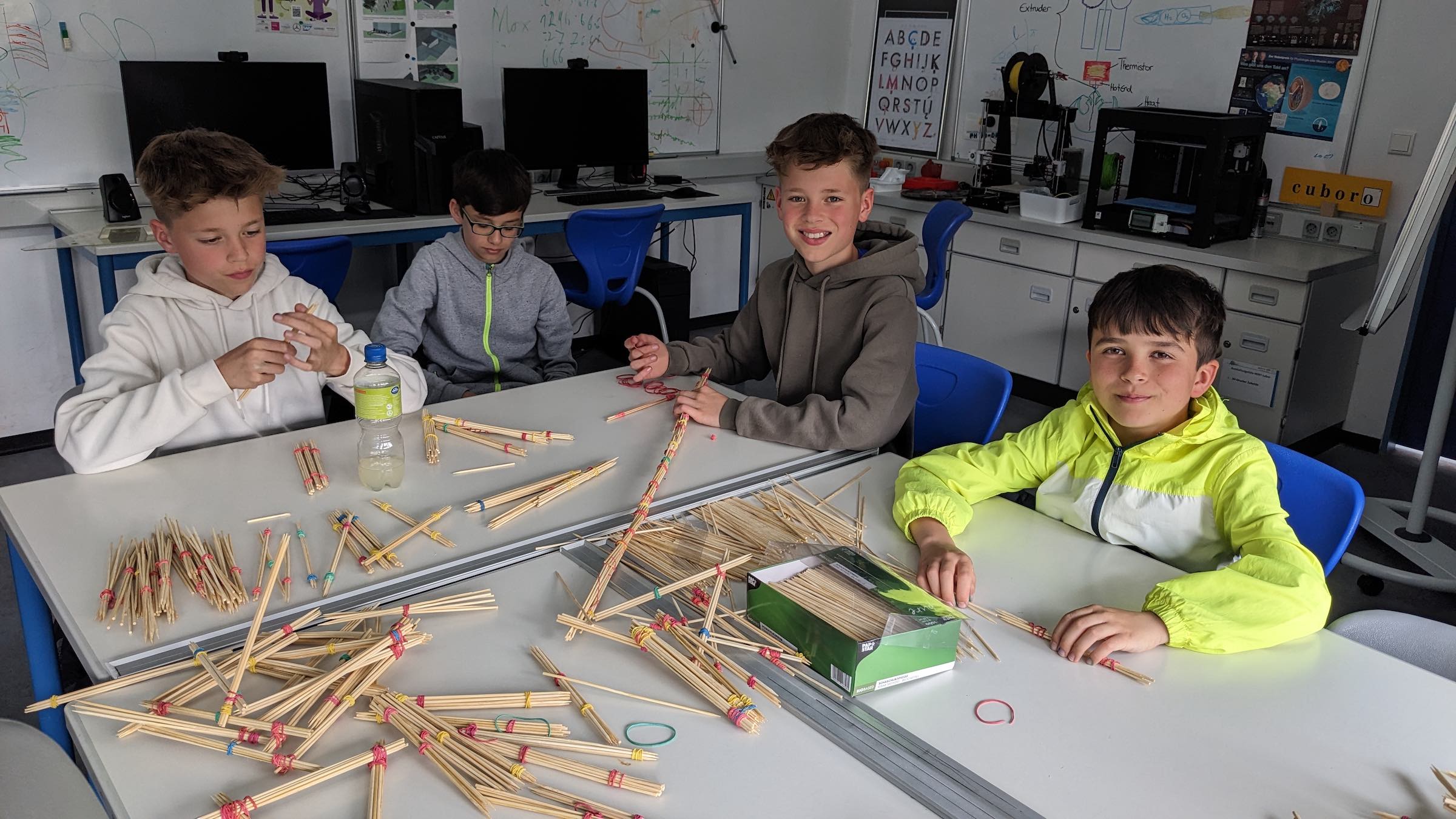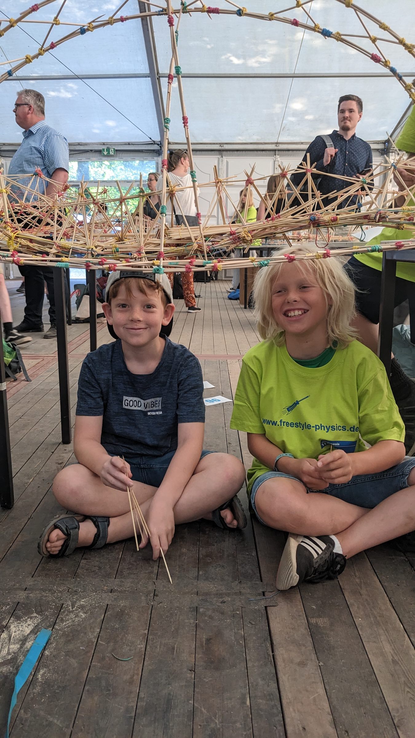 Die Aufgabe bestand darin, eine 1m lange Brücke nur aus Schaschlikspießen und Gummibändern zu bauen. Die Brücke sollte ein möglichst geringes Eigengewicht haben, gleichzeitig aber ein Gewicht von 700g aushalten.